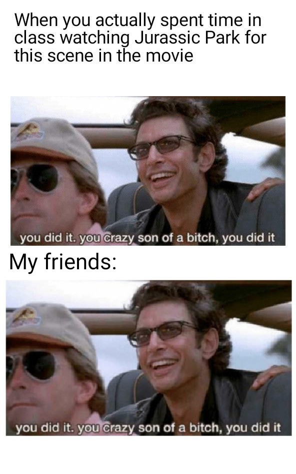 Ian malcolm jeff goldblum dinosaurs reaction images tdxsfw squaredem drgrayfang about you did it. The textual content of this image is harassing me or someone i know the visual content of this image is harassing me or someone i know both the textual and visual content are harassing me or someone i know. The crazy son of a bitch you did it is a memorable quote uttered by the character dr. Some think it comes from street fighter ii while others say it first appeared in super smash brothers.